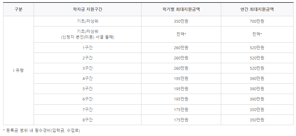 - I 유형 : 해당 학기 등록금 필수경비(입학금, 수업료)를 초과하지 않는 범위 내에서 차등지원