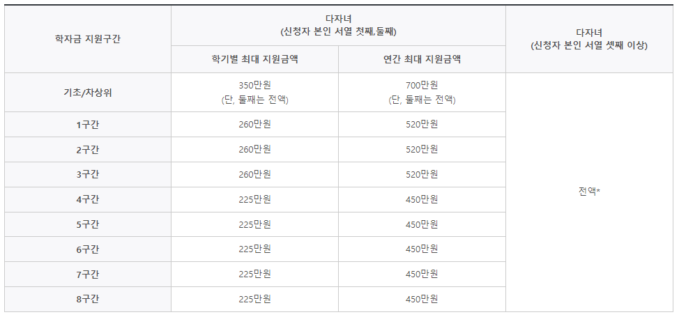 - 다자녀 : 국내대학의 학자금 지원 8구간 이하, 3자녀 이상의 가구원인 대학생(미혼에 한함, 연령 무관)