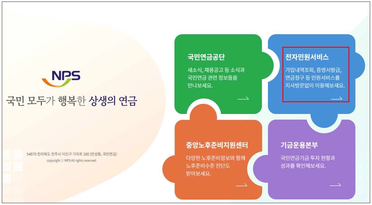 1. NPS 국민연금공단 사이트로 접속해서 전자민원 서비스를 클릭합니다.