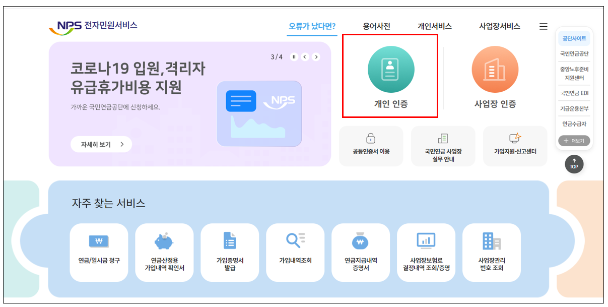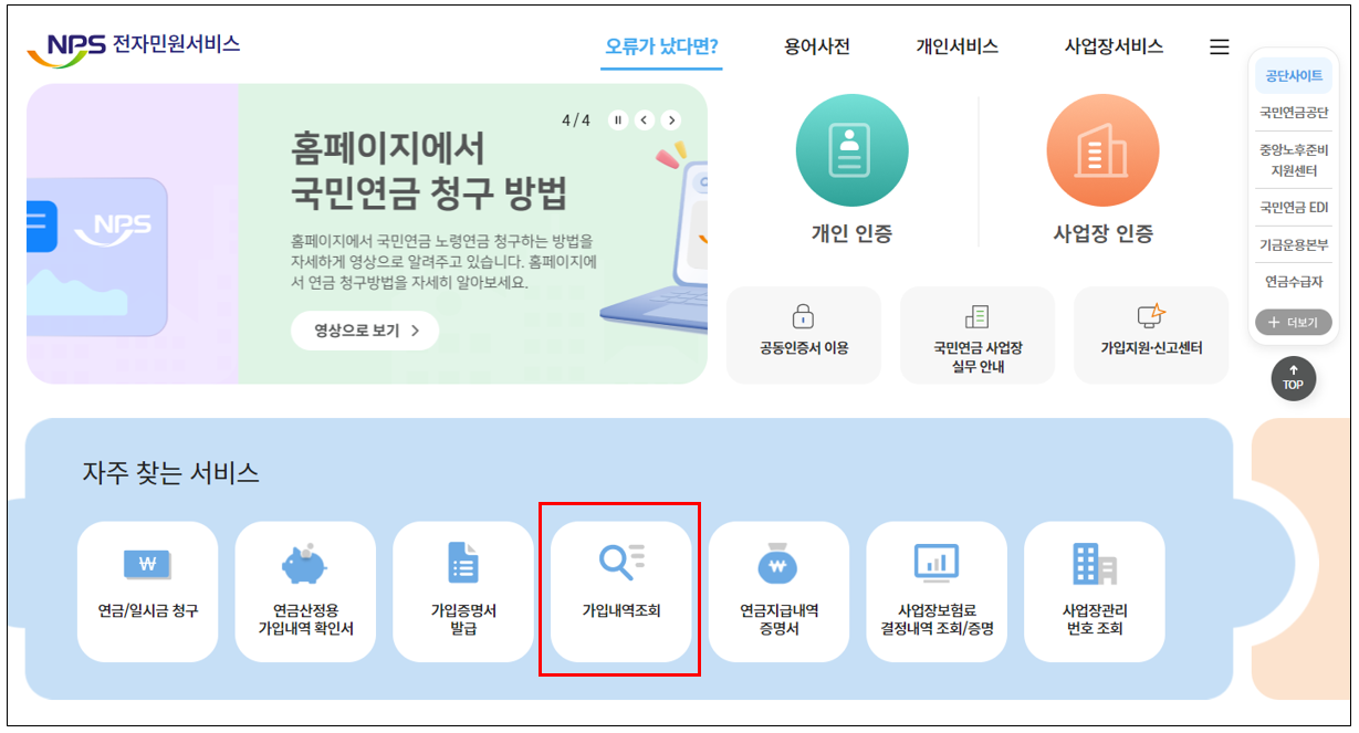 - 국민연금공단 홈페이지>전자민원>개인인증>개인로그인>조회>가입내역조회