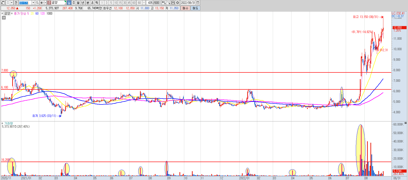 금양의 기세가 대단하다. 앞전에 내가 금양과의 안좋았던 기억을 포스팅한 적이 있다. 그날이 7월 26일 2연상으로 마감한 날이었다. 그날로부터 한 달 여가 지나 8월 월봉을 완성한 오늘 금양의 주가는 12,050원으로 마감하여, 포스팅했던 그날부터 약 한 달여 동안 29.3% 상승하였다. 지난 한 달간의 상승률을 보면 그다지 대단해 보이진 않지만, 7월 한 달 동안의 상승률이 무려 72.87% 였다. 8월 월봉을 마감한 오늘 7~8월 2개의 월봉을 합친 상승률은 114%에 이를 정도로 이번 7~8월 여름장에서 가장 뜨거웠던 종목 중의 하나였다. 아래 월봉 차트를 보자. 7월과 8월의 두 개의 장대 양봉이 유난히도 눈에 띈다. 이 2개의 월봉상 장대 양봉으로 인해 금양의 주가는 코로나 저점 이후 무려 700%에 가까운 상승률을 보여주고 있다.
