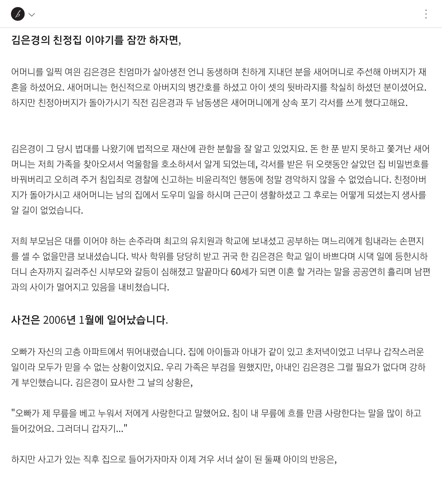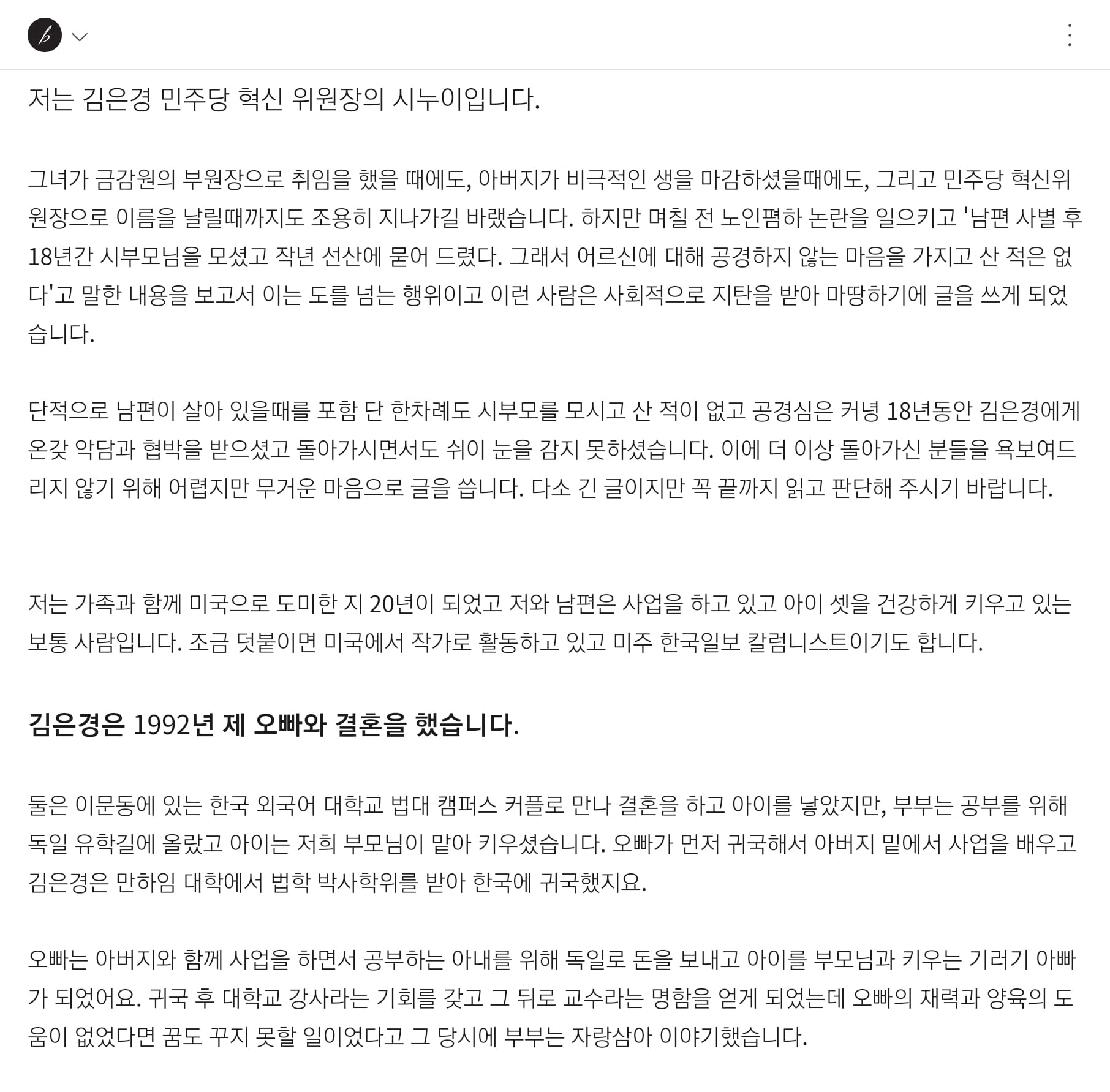 먼저 김은경 민주당 혁신위원장의 시누이라는 분의 원문글로 안내드리겠습니다.