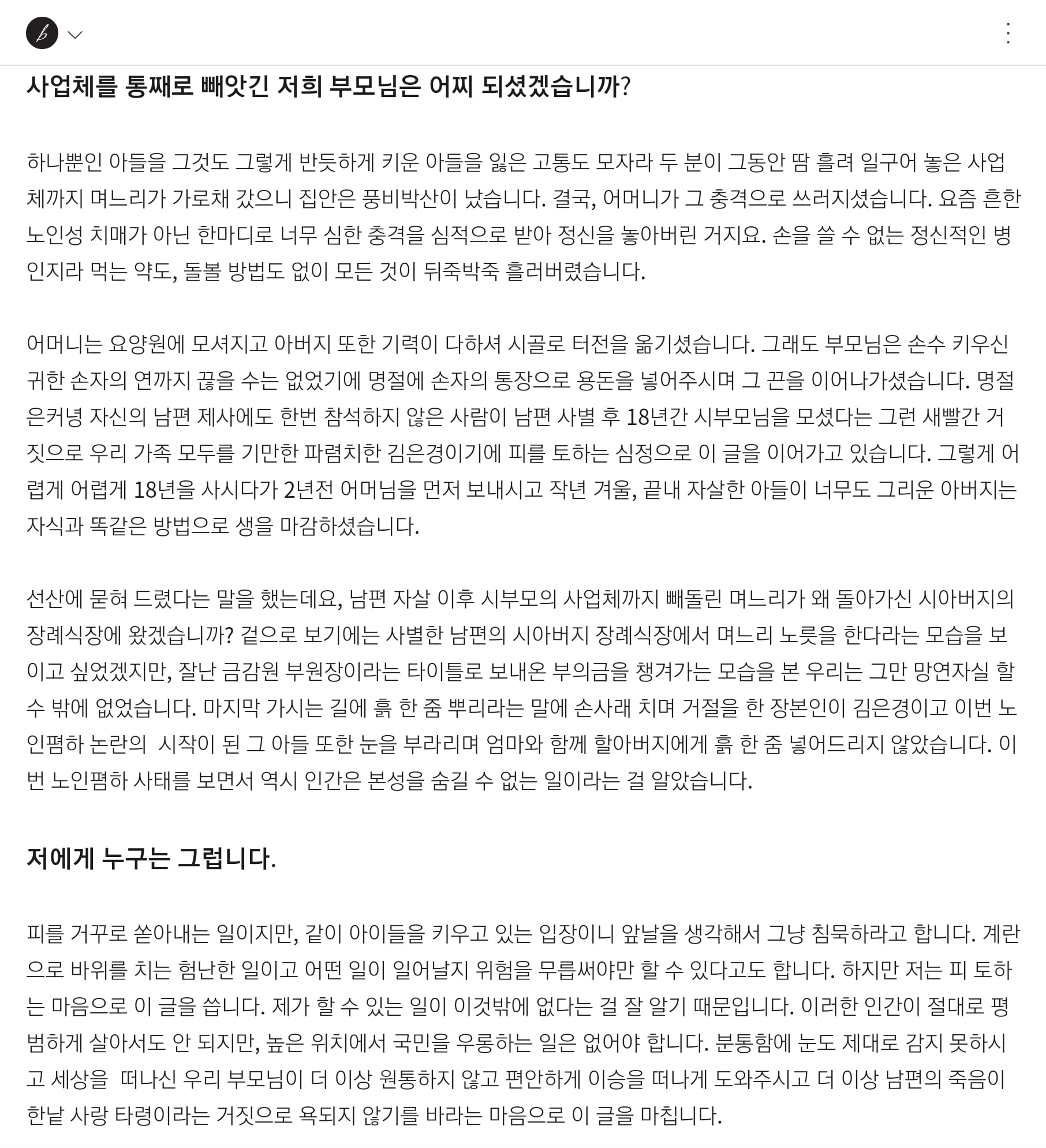 김은경 혁신위원장의 시누이라는 분의 윗글이 사실이라면 참 인간으로서는 해서는 안될 짓을 한 김은경 혁신위원장이네요. 본문글이 사라질 수 도 있으니 캡처해서 올려드리고 첨부파일로도 업로드하겠습니다.