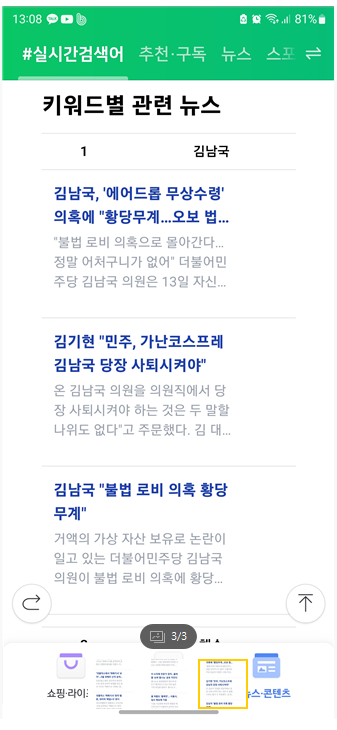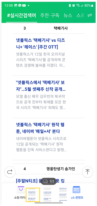 네이버 실시간 검색어 사용예시는 다음 그림을 보세요. 우선 모바일 화면입니다.