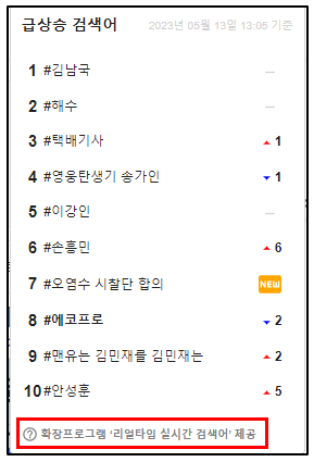 2023년 5월 13일 13:01분 현재 모바일 화면에서 보이는 실시간 검색어 순위입니다.