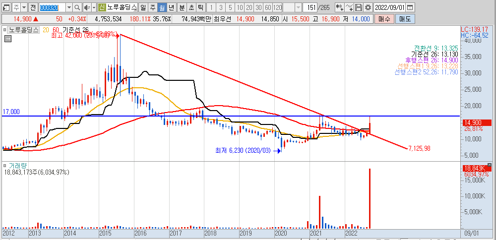 하지만, 앞에서도 설명했다시피 월봉 마감시점에서 정배열에 놓이거나 또는 위의 저항성 17,000원을 돌파 후 안착한다면 노루홀딩스 주가는 중장기 우상향을 기대한다. 월봉 차트가 너무나 좋다. 시가총액이 낮은만큼 단기간 급등도 가능한 구간이라 본다. 조금 욕심을 내자면 100% 이상의 수익률을 내심 기대해 본다.
