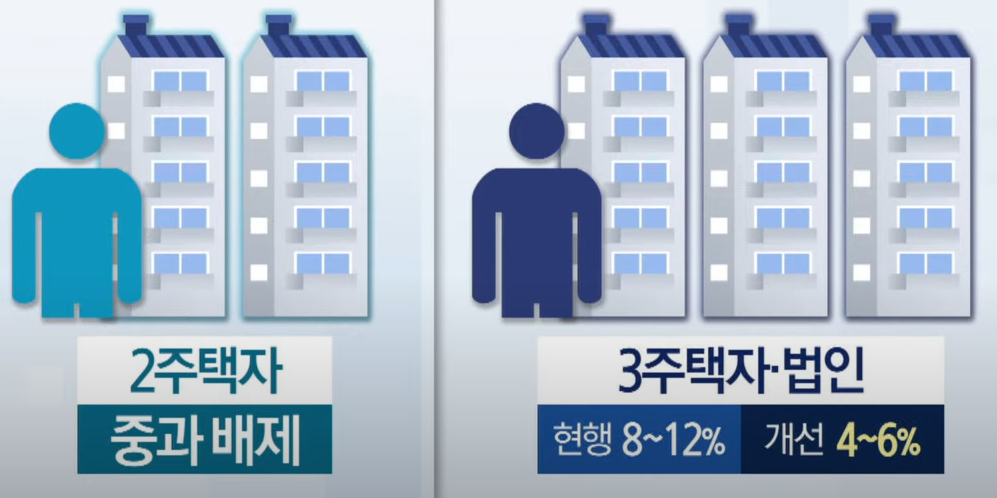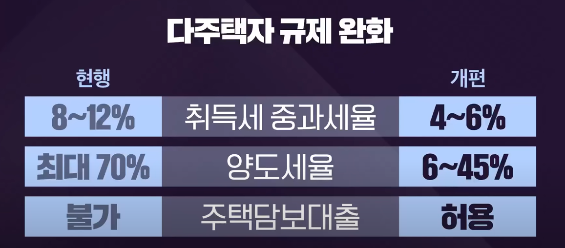 무주택자들이 지갑을 닫고 투자 심리가 위축된 상황이기 때문에 결국 돈이 있는 자금 여력이 되는 구매 여력이 되는 다주택자들이 집을 사라는 신호 부동산 경창륙을 막아보겠다는 의도로 해석된다.