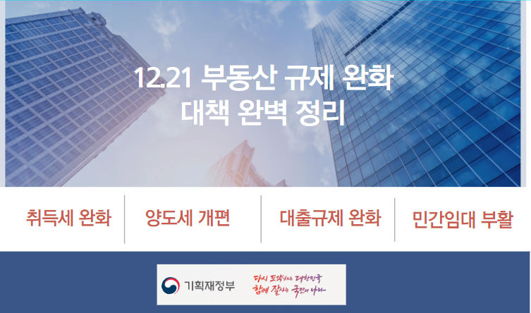 정부는 지난 12월21일 부동산 대책을 내놓았다. 초점은 다주택자 규제 완화이다. 다주택자들이 집을 더 사도록 해 부동산 시장을 연착륙시키겠다는 것이다. 이 발표로 인해 기획재정부 홈페이지가 먹통이 될 정도로 국민적인 관심이 뜨거웠다. 다주택자 규제완화를 통해 부동산 시장 경착륙을 막아보겠다는 뜻으로 풀이되는 이번 부동산 대책을 살펴보자.