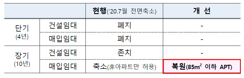 이번에 눈길을 끄는 대책 하나가 더 있다. 지난 정부 때 장려했다 손바닥 뒤집듯 없앤 민간 등록 임대도 부활한다. 4년 등록임대 사업자 및 8년 아파트 등록 임대사업자 제도를 폐지하고, 민간 등록 임대를 보완하고 임대차 시장 안정을 도모해 나간다는 것이다. 앞으로는 전용 85제곱미터 이하 아파트를 10년 장기 매입해 임대하면 세제 혜택을 받을 수 있다.