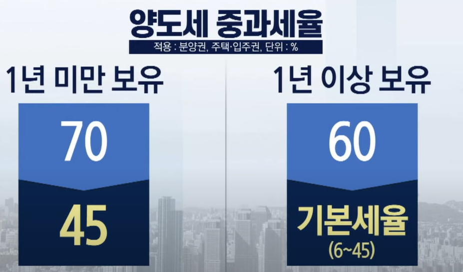한시 유예 중인 양도세 중과배제도 연장 (~24.5)하고 세제개편안('23.7)을 통해 근본적인 양도세 개편안을 마련할 예정이다. 분양권 및 주택 입주권의 단기 양도세율도 2020년 이전 수준으로 되돌린다. 1년 미만은 45%까지 낮추고, 1년 이상이면 기본 세율을 적용한다.