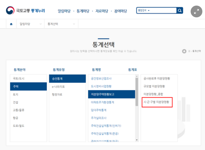 위의 경로대로 따라가면 공사완료후 미분양 현황, 규모별 미분양 현황, 미분양 현황 종합, 시/군 구별 미분양 현황을