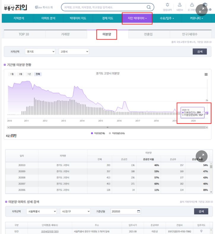홈페이지 메인화면에서 '지인빅데이터' 탭을 선택한 후 '미분양' 선택 후 검색을 하면 아래와 같이 조회 가능하다.