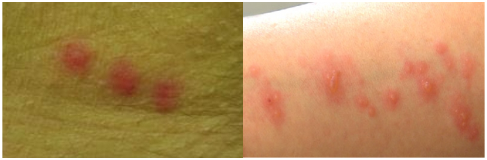 빈대에 물리면 일반적으로 연속으로 2~3개의 자국이 생기고 (왼쪽사진), 여러번 물렸을 경우 오른쪽 사진처럼 물린 자국이 무리를 지어 나타나게 됩니다. 빈대에 물리면 가려움증을 유발하여 긁게되면 2차 감염도 유발할 수 있습니다.