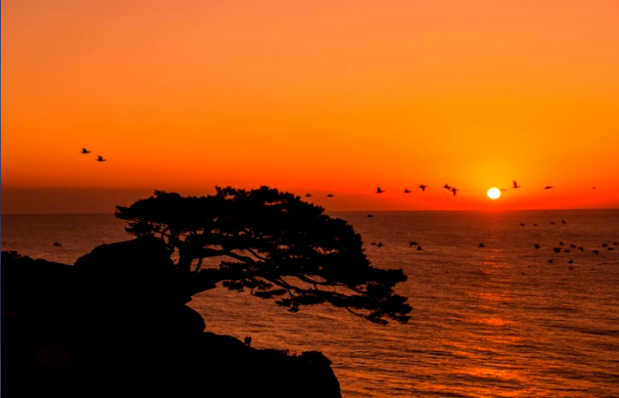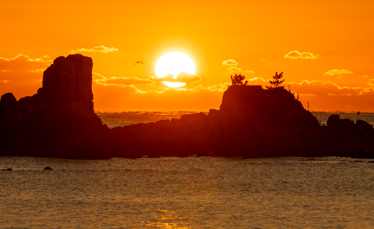 강원도 양양군 현북면에 위치한 암석해변인 양양 하조대는 양양 8경 중의 하나로 해변의 기암괴석과 우뚝 솟은 노송 그리고 육각정이 어우러진 아름다운 풍경을 자랑한다. 이러한 곳에서 동해 위로 떠오르는 태양 그리고 위 사진처럼 갈매기 떼까지 날아가는 구도가 나오면 절경 중의 절경을 이룬다.