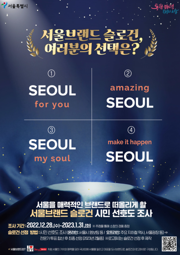 서울을 대표하는 신규 브랜드 슬로건 시민 선호도 조사에 참여해주세요.