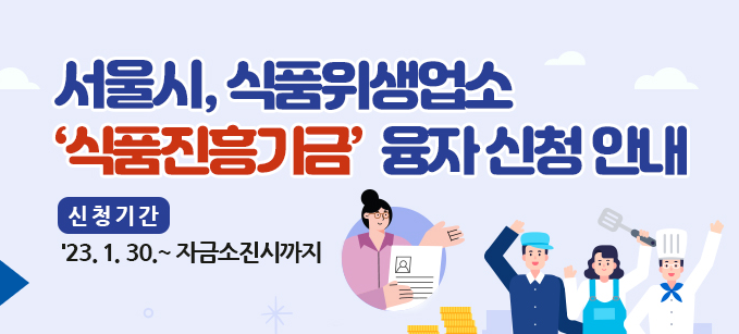 식품 진흥기금 융자지원 식품위생업소 영업주의 경제적 부담 완화 및 위생환경 선진화와 시설 현대화를 위해 식품진흥기금 융자 지원을 추진하고 있습니다. 2023년 서울시 식품진흥기금 융자지