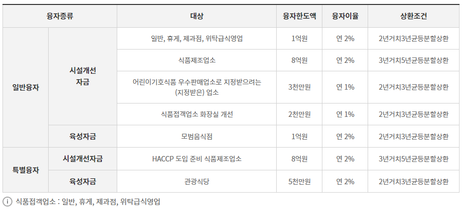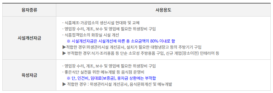 시설개선자금은 일반음식점, 휴게음식점, 제과점, 식품제조업소의 영업장 시설개선에 필요한 자금을 지원합니다.