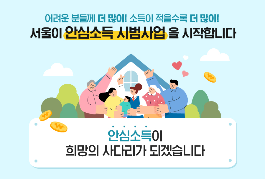 서울시에서 실시하는 안심소득 시범사업 2단계 참여가구를 모집한다는 소식이 전해졌습니다. 안심소득이란 일정 소득 이하 가구에 대해 부족한 소득의 일부를 지원하여 최소한의 생계를 보장하는 제도입니다. 쉽게 말해 국가가 최저생계비를 정해놓고 기초생활수급자에게는 현금으로 지급하지만 차상위계층에겐 아무런 혜택이 돌아가지 않는 문제점을 보완하고자 마련된 제도인데요. 자세한 내용은 아래를 통해서 소개드릴게요.