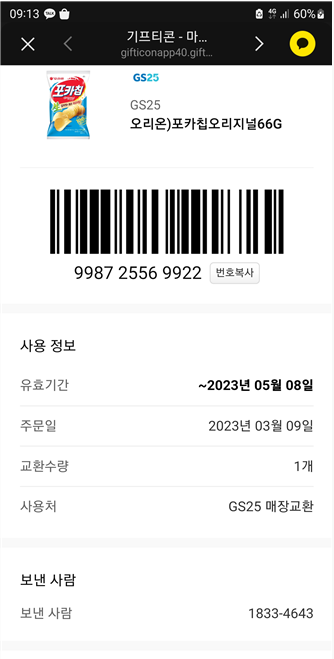 지난번 서울시 로고 조사에서는 아래와 같이 포카칩 기프티콘을 받았어요. GS25에서 낼름 교환해서 잘 먹었습니다.