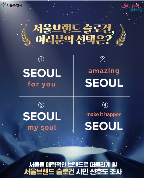서울시는 시민 공모와 전문가 검토 등을 통해 최종 브랜드 슬로건 후보로 △Seoul for you △Amazing Seoul △Seoul, my soul △Make it happen, Seoul을 선정하고, 온라인과 오프라인을 통해 한 달간 국내/외 선호도 조사를 실시하였습니다.