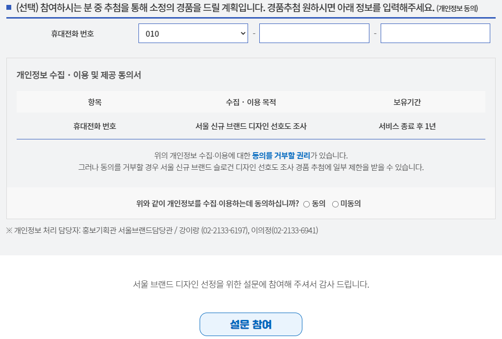 참여하시는 분들을 대상으로 추첨을 통해 소정의 경품도 준다네요. 개인정보 이용 동의 하시고 휴대전화 번호를 입력하시고 설문참여 버튼을 누르시면 됩니다.