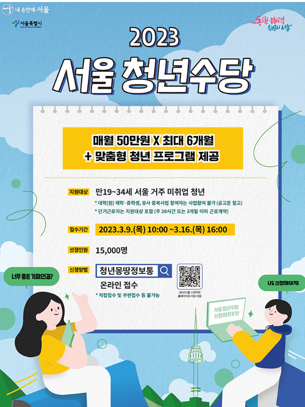 서울시에서 청년들이 구직활동과 진로탐색에 집중할 수 있도록 '서울 청년수당' 제도를 시행합니다.