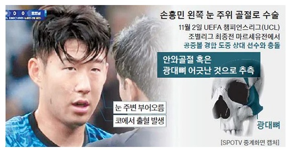 11월 4일 영국 텔레그라프의 보도에 따르면 정밀검사 결과 손흥민 선수의 눈 주변의 안와 총 4곳의 골절이 확인됐다고 한다.