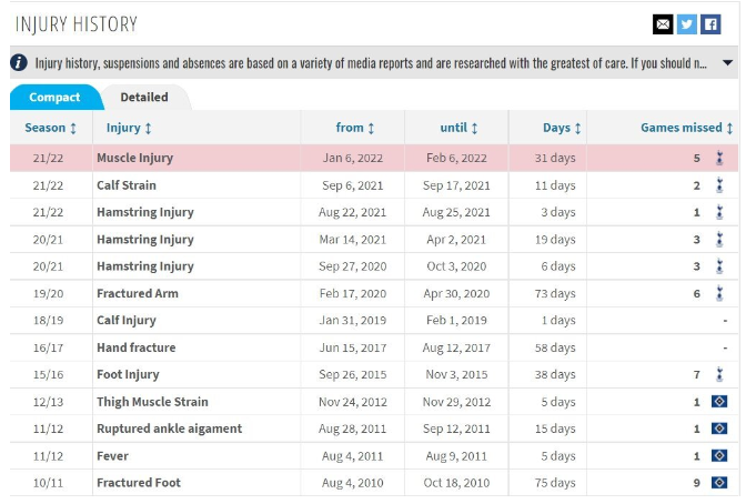 아래 손흥민 선수의 부상 이력에서도 보듯이 일반적인 보통의 선수보다 부상으로 결장하는 경기수가 확연히 적다.