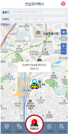 목적지까지 안전하게 가는지 실시간 모니터링이 이루어지고 또 위기 상황시 바로 신고도 할 수 있어요.