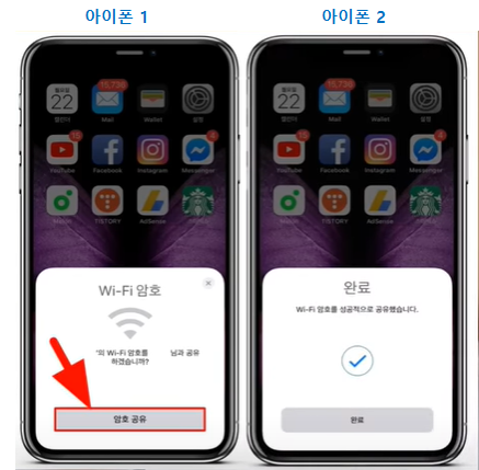아이폰끼리 와이파이 비밀번호 공유하는 방법은 더 간단합니다. 우선 연락처가 저장된 두대의 아이폰이어야 쉽게 공유가 됩니다.