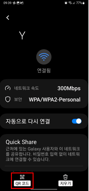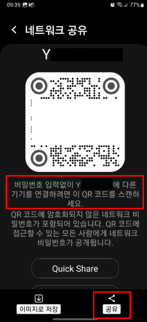 비밀번호 없이 해당 와이파이를 다른 기기에 연결하려면 QR코드를 스캔하시면 비밀번호 공유됩니다. QR코드에 암호화되지 않은 네트워크 비밀번호가 포함되어 있기에 QR코드만 스캔하면 자동으로 와이파이 연결이 됩니다. 해당 QR코드에 접근할 수 있는 모든 사람은 이렇게 해서 비밀번호 공유가 됩니다. 맨 아래의 공유를 눌러서 다른 사람에게 전달해도 됩니다. 참 쉽죠?