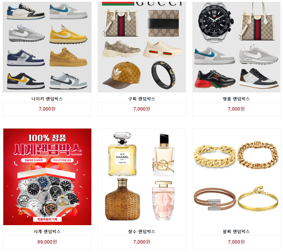 나이키 랜덤박스 7000원, 구찌 랜덤박스 7000원, 명품랜덤박스 7000원, 시계 랜덤박스 99000원, 향수 랜덤박스 7000원, 팔찌 랜덤박스 7000원으로 시계를 제외한 나머지 랜덤박스 상품은 모두 7천원에 구매를 할 수 있네요.