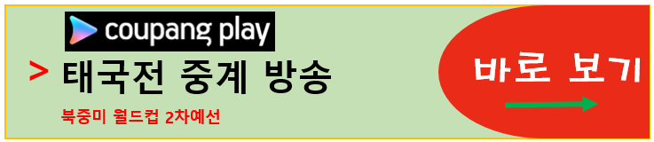 북중미 월드컵 아시아 2차 예선 이번 태국과의 2연전은 TV는 TV조선, 인터넷 및 모바일은 쿠팡플레이를 통해서 시청하실 수 있습니다. 아래 링크를 클릭하시면 해당 중계방송으로 바로 안내 도와 드립니다.