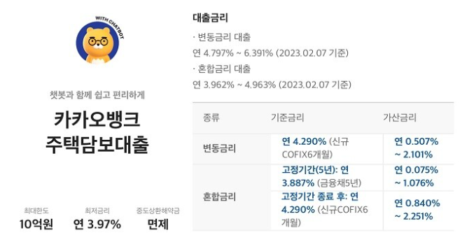 카카오뱅크에 따르면 2월 7일의 혼합(고정) 주택담보대출 금리는 연 3.962~4.963%를 기록했습니다.
