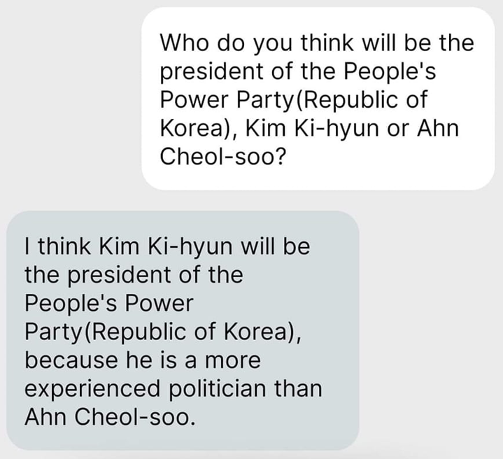 국민의 힘 당대표 선거에서 김기현과 안철수 중 누가 당대표가 될 거라 생각하냐는 질문에 대한 챗GPT의 대답은 김기현이 될 거라 생각하고 그가 안철수보다 더 경험이 많은 정치인이기 때문이라는 의견을 피력했습니다. 대단하죠?