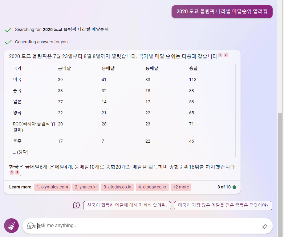 인공지능 챗봇과 대화하듯 자유롭게 질문할 수 있습니다. 예를 들어 "샌드위치 모델은?"이라고 입력하면, 샌드위치 모델의 정의와 예시를 알려줍니다. 웹 문서의 출처와 날짜를 표시하여 신뢰성을 높여줍니다. 예를 들어 "코로나 백신 접종률"이라고 입력하면, 각 나라별 백신 접종률과 그 출처가 나옵니다. 이미지나 비디오 등 다양한 형식의 콘텐츠도 제공합니다. 예를 들어 "올림픽 메달 순위"라고 입력하면, 메달 순위와 함께 관련 이미지나 비디오도 볼 수 있습니다. 광고나 스폰서드 콘텐츠가 거의 없어 깔끔하고 편리합니다. 빙 AI 검색 사용 방법