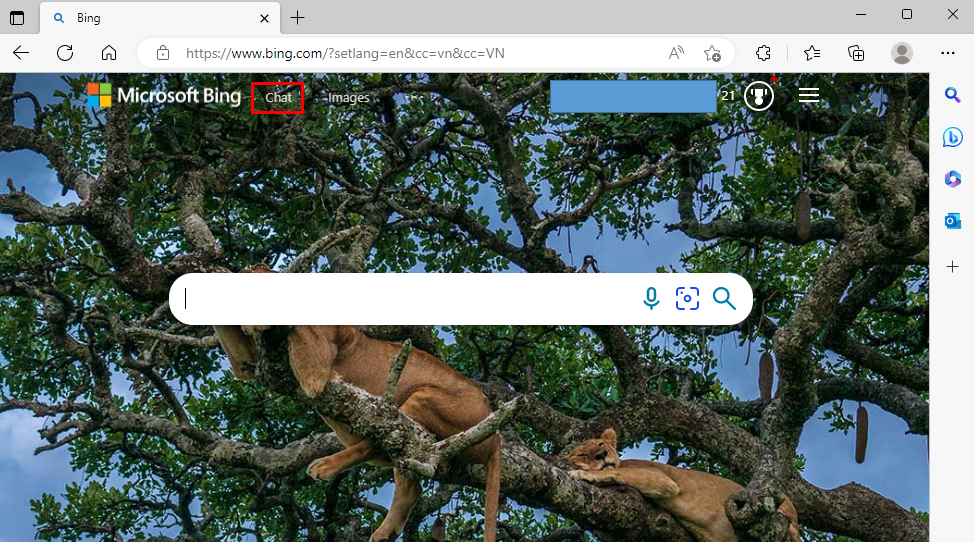 마이크로소프트 빙 홈페이지(https://www.bing.com/)에 접속하여 로그인합니다. 로그인하지 않으면 일반적인 빙 서비스만 이용할 수 있으므로 주의하세요. 로그인 후 상단 왼쪽에 있는 MS Bing 아이콘 옆에 있는 ‘Chat’ 버튼을 클릭합니다.