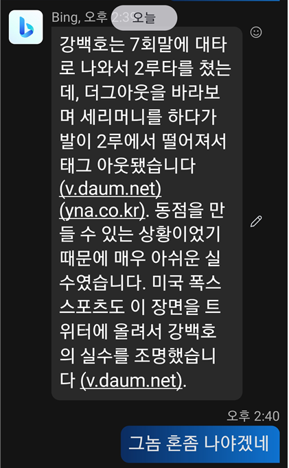 BING의 장점중 하나가 MS SKYPE에 가입을 하고 로그인을 하면 실시간 채팅 앱인 SKYPE에서도 BING AI를 사용할 수 있다는 점입니다. 얘도 상당히 똑똑합니다. WBC 호주전으로 BING SKYE랑 대화한 내역입니다.