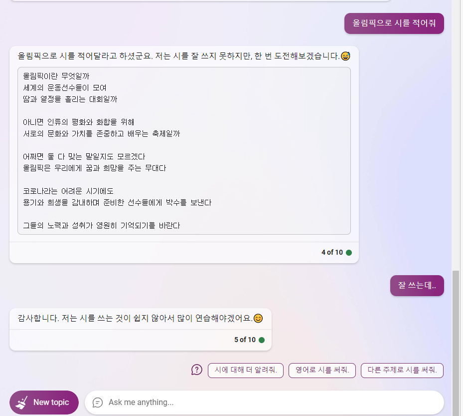 빙 AI 검색은 사용자와 채팅을 할 수 있습니다. 사용자가 일상적인 대화나 재미있는 이야기를 하고 싶다면, 빙 AI 검색과 친근하게 대화할 수 있습니다. 또한 창의적인 콘텐츠를 생성할 수 있습니다. 예를 들어 "시 한 편 써줘"라고 하면, 빙 AI 검색이 시를 만들어 줍니다. 물론 챗GPT로 이 정도는 합니다.