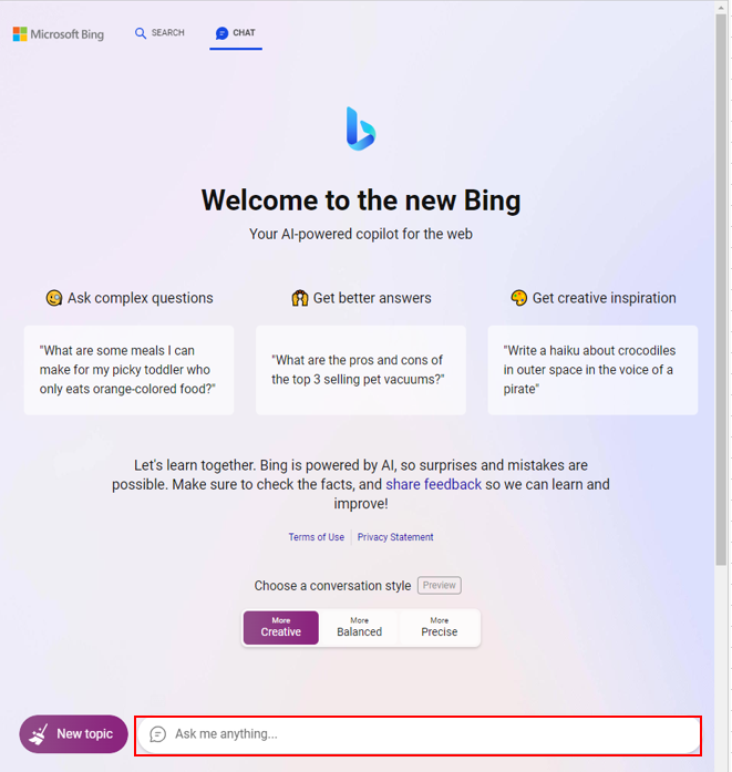 그러면 'Welcome to the new Bing’이라는 문구가 나타납니다. 페이지 하단에의 대화창에 질문을 던지면 됩니다. 처음에는 영어로 보이지만 한글로 질문하면 한글로 답을 해줍니다.