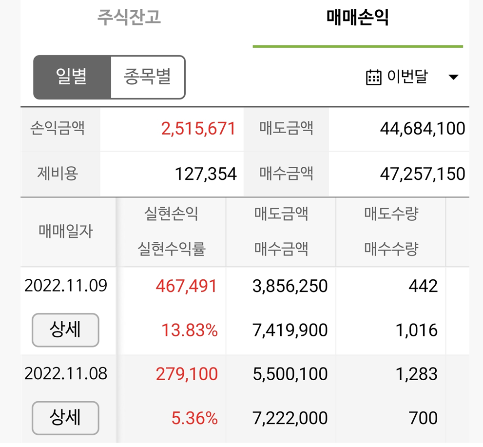 주식시장이 매우 불안하다. 불안한 증시 상황으로 중장기 스윙계좌를 모두 없애고 11월 부터는 단타 스윙 계좌로 운영하고 있다. Daily Trading (스캘핑) 보다는 2~3일 주기로 매수와 매도를 반복한다. 여러 종목으로 진행되기에 회전율이 빠르고, 수익실현 속도가 빠른게 큰 장점이다. 그동안 운영해 오던 중장기 계좌는 지난달 전부 정리했다. 테마주, 수급주 위주로 단기 매매를 하다보니 장중에는 고도의 집중이 필요하다. 현금은 30~40%선에서 비중을 많이 줄여서 투자중이지만, 수익이 꽤 괜찮다. 이에 아래와 같이 11월부터 운영한 단타계좌 현황을 공개한다. 11월 1일 부터 시작해서 오늘 11월 8일까지 7거래일 동안 약 250만원 수익실현 하였다. 일평균 35만원 수익실현이다. 오랫만의 단타계좌 ..