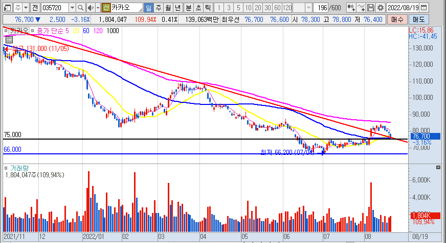 카카오 그룹주 반토막만 나도 다행 코로나 이후 유동성 장세에서 대장주로 코로나 저점 대비 600% 이상 상승하며 한국 증시를 이끌었던 카카오의 주가가 불과 1년 1개월 만인 지난 7월 4일은 고점 대비 61%나 하락하였다. 이후 반등세도 미약하여 지난 8월 19일 금요일 종가 기준 저점 대비 15.86%의 회복세만 보여주고 있다. 고점 대비 55.5% 하락률이다. 이른바 카카오 4형제들 중 카카오를 제외한 동생들의 주가 하락률은 더 심각하다. 8월 19일 종가 기준으로 카카오페이 -72.3%, 카카오 뱅크 -69.7%, 카카오 게임즈-52.2%로 반토막만 나도 다행인 상황이다. 겹악재에 무너진 반등세 작년 9월 정부의 빅테크 기업 관련 규제가 나오면서 본격적인 하락세를 타기 시작한 카카오의 주가는 이후 ..